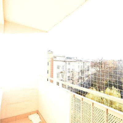 Balkon typu loggia z widokiem na ciche, zamknięte podwórko (nie słychać ruchu ulicznego)